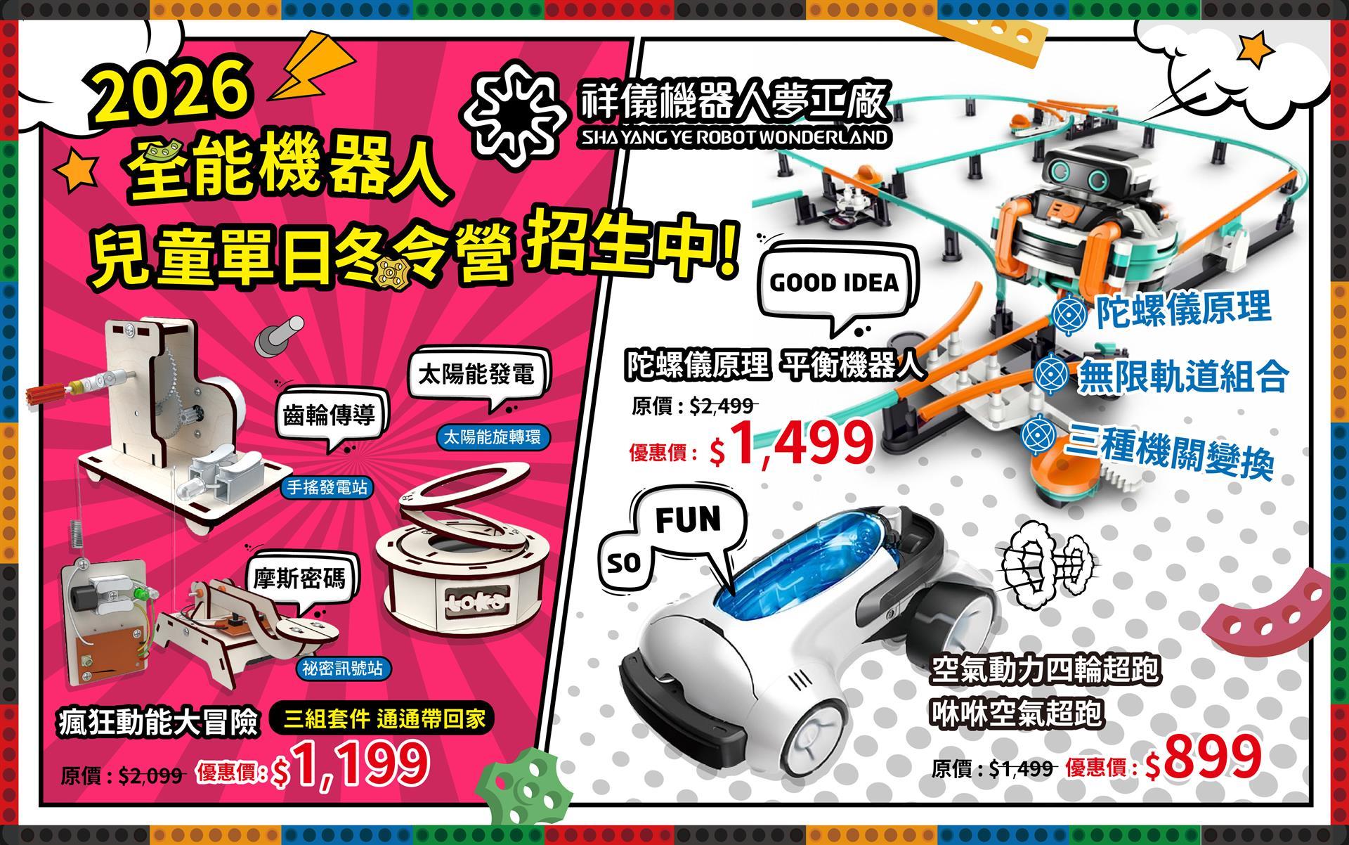 「空氣動力四輪超跑-咻咻空氣超跑」,課程為 09:00–17:00 的單日營隊,完整涵蓋動力原理、結構組裝與實際操作體驗,節奏明快且富含挑戰性,適合安排為寒假中的一日科技實作體驗。課程透過造型感十足的空氣動力超跑,引導孩子認識打氣汽缸與車體結構的結合,實際測試速度與距離,培養工程思維與動手能力。第一梯次於 2/1(日)開課,第二梯次於 2/14(六)開課,優惠價為 $899(原價 $1,499)。